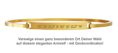 Und so einfach funktioniert es: Du trägst in das obige Textfeld die Längen- und Breitengrade sowie die entsprechenden Himmelsrichtungen ein. Ein Beispiel solcher Geokoordinaten findest Du auf den Bildern. An die Daten gelangst du ganz leicht über Onlinekarten. Bitte beachte, dass wir nur Koordinaten und keine Adressen auf den Armreif gravieren können!