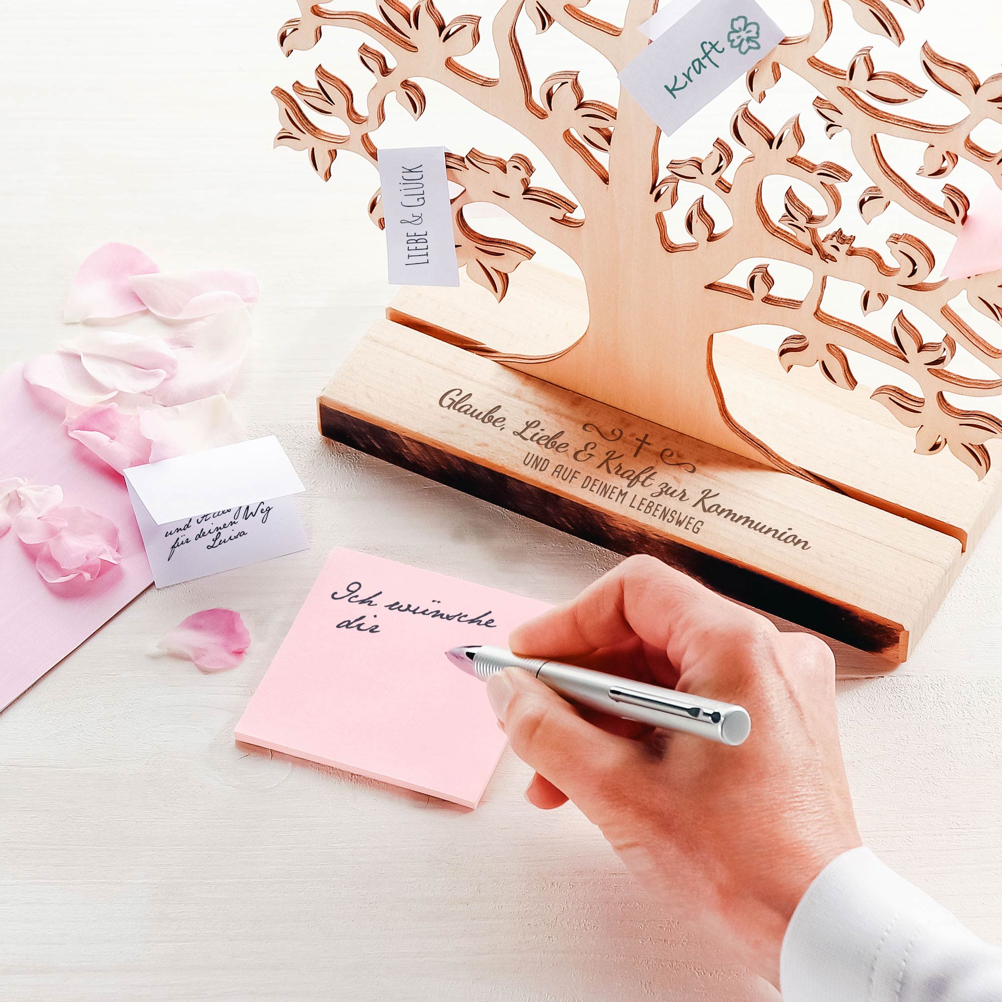Passend zum feierlichen Anlass der Kommunion ist auf dem glatten Holz-Sockel der Schriftzug "Glaube, Liebe & Kraft zur Kommunion und auf Deinem Lebensweg" sowie ein Kreuz-Motiv verewigt. Mit der Gravur überbringst Du nicht nur Deine Glückwünsche auf stilvolle Art und Weise, sondern verschenkst auch eine stilvolle Dekoration mit hohem Erinnerungswert. Aufgestellt im Regal, Sideboard oder auf dem Schreibtisch wird der kleine Baum zu einem unvergleichlichen Andenken: