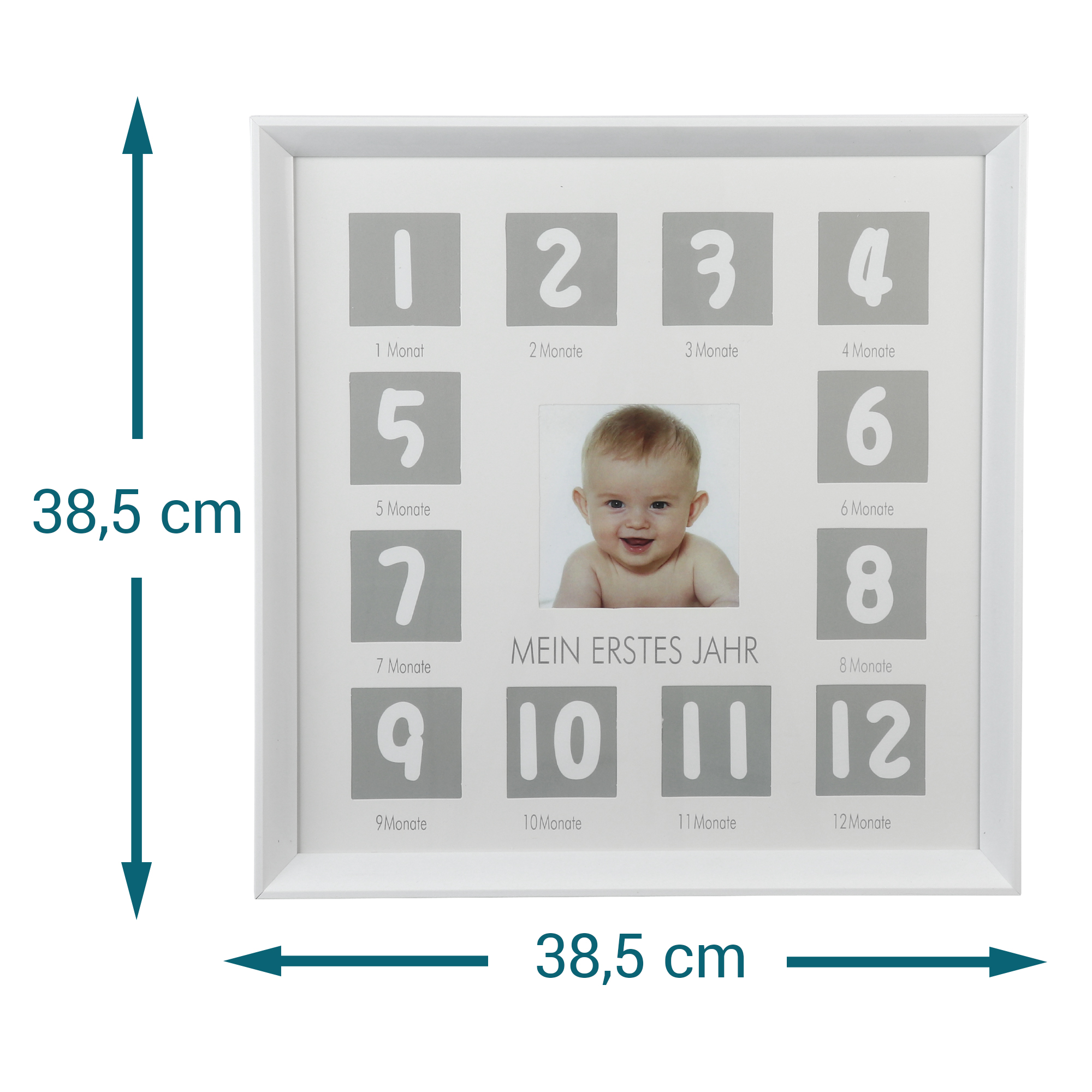 - Mit nummerierten Fotoboxen für jeden Monat des ersten Lebensjahres