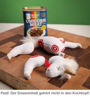 Das Einhorn ist seit je her ein stolzes Tier. Als entsprechend zart und aromatisch gilt das Fleisch und bekömmlich die enthaltenen Proteine. Tausende Jahre Mythos lassen das Fleisch lange lange reifen, ohne an Frische einzubüßen. Auf Grund der evolutionären Herkunft des lieblichen Wesens kommt das Einhorn mit einer dezenten Geschmacksnote vom Pferd daher und eignet sich deshalb als Hackvariante wunderbar auch für Lasagne. Was darf es sonst sein? Hüfte? Schinken? Gulasch? Filet? Die schmerzende Qual der Wahl nehmen wir Ihnen in unserem Konservenangebot ab. Alles drin! Ohne Zusatz von Konservierungsstoffen. Dafür könnten Spuren von Feenstaub enthalten sein. Reichen Sie dazu Püree, Reis oder Knödel sowie Erbsen und Möhren. Außerdem eine leckere Rahmsauce und ein deliziöser Weißwein. Beachten Sie bitte: Nur die wenigsten Landwirte züchten Einhörner. Unser Einhorn Dosenfleisch - selbstverständlich enthornt - stammt aus kontrollierter Viehzucht und ist damit eine rare Köstlichkeit für jeden Feinschmecker!