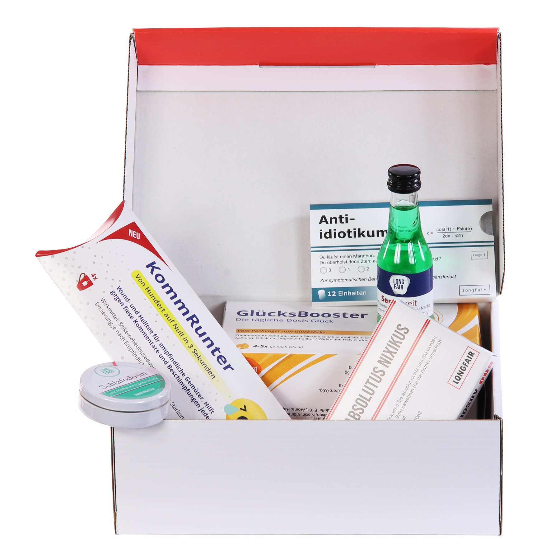 Natürlich handelt es sich hierbei nicht um ein echtes Erste-Hilfe-Set mit ernstzunehmenden Arzneimitteln. Vielmehr ist es ein Erste-Hilfe-Kasten der lustigen Art! Oder hast Du etwa schon mal "Medikamente" namens Anti-Idiotikum, GlücksBooster oder Schlafodosin in einem echten Erste-Hilfe-Kasten gesehen? Sicherlich nicht! Dazu kommen übrigens noch weitere witziges Hilfsmittel namens KommRunter, Absolutus Nixikus und SemiBreit. Bei letzterem, handelt es sich um echten Likör, weshalb der Kasten nicht an Personen verschenkt werden sollte, die das Alter von 18 Jahren noch nicht erreicht haben.