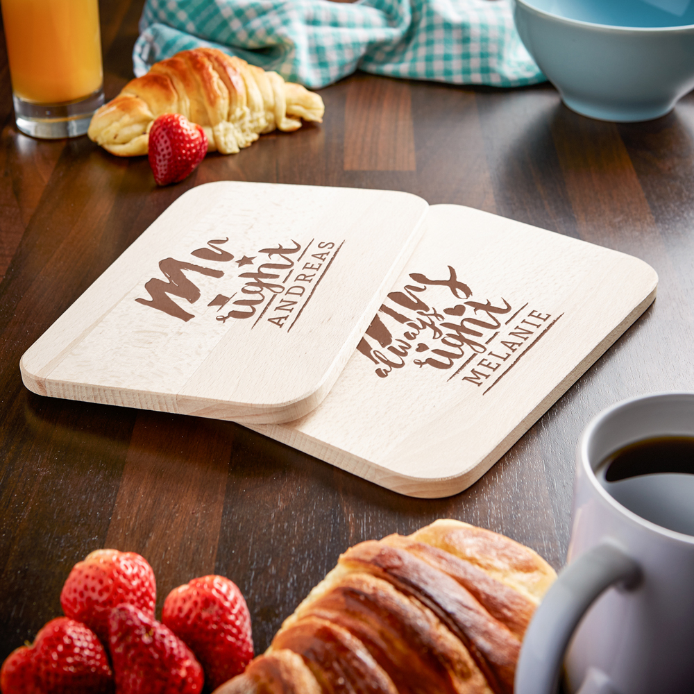 Dieses lustige Brettchen Set übermittelt eine klare Botschaft als Gravur: Es gibt einen Mr Right und es gibt eine Mrs - always - Right! Da gibt es nichts zu rütteln! Und damit die Frühstücksbretter eine einzigartige Note bekommen, werden sie von uns für Dich personalisiert mit Wunsch-Vornamen. Ganz egal, ob als Geschenkidee für die Eltern, für ein befreundetes Pärchen oder für Dich und Deine bessere Hälfte...