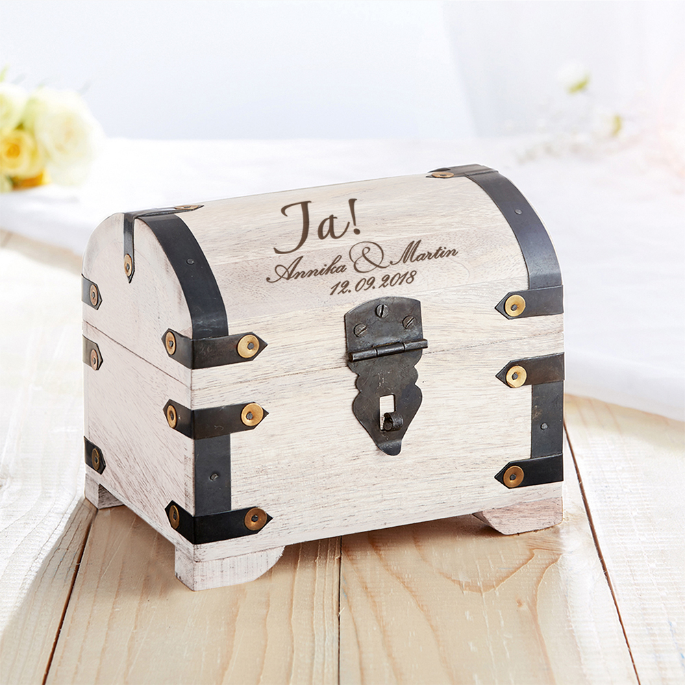 Viele Menschen, die zu einer Hochzeit eingeladen werden, stellen sich folgende Frage: Was schenke ich einem Paar zur Hochzeit? Wenn Du Dir gerade diese Frage stellst, möchten wir Dir natürlich gerne mit einer Geschenkidee helfen: verschenke am besten die Geld Schatztruhe zur Hochzeit Liebestauben - Weiß! Warum? Ganz einfach: Geld ist traditionell ein beliebtes Hochzeitsgeschenk. Nur ist es eher unpersönlich, es dem Brautpaar einfach zuzustecken. Natürlich kann man es dem frisch gebackenen Ehepaar in einem Umschlag überreichen. Aber es ist nun mal viel persönlicher und schöner, wenn man ein schickes Behältnis für das Geld wählt. Man muss aber nicht zwangsläufig Bargeld in diese rustikale Holzkiste platzieren. Denkbar sind auch Gutscheine, Schmuck und alles andere, was einen materiellen oder symbolischen Wert besitzt und darin Platz findet!