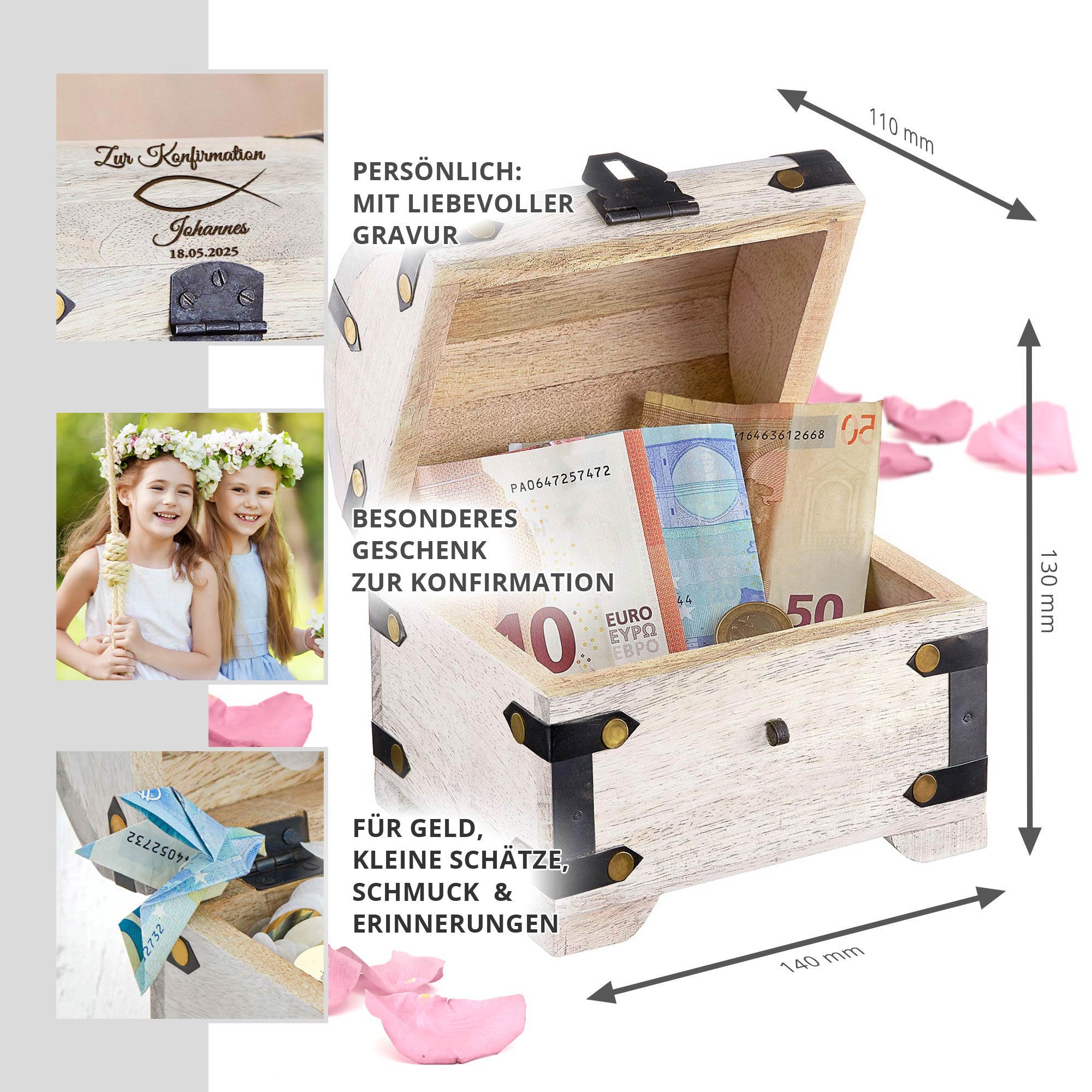 Diese Schatztruhe bietet nicht nur einen schönen Ort, um Geldgeschenke zur Konfirmation zu präsentieren, sondern sie kann auch als Schmuckkästchen oder zur Aufbewahrung besonderer Erinnerungsstücke genutzt werden. Mit ihrer robusten Konstruktion und dem liebevoll gestalteten Design ist diese Truhe ein Geschenk, das lange Freude bereitet und den besonderen Tag des Konfirmanden gebührend würdigt. Verschenke mit unserer weißen Holz-Schatztruhe mit Gravur ein Stück Erinnerung und Inspiration, das für immer in den Herzen bleibt.
