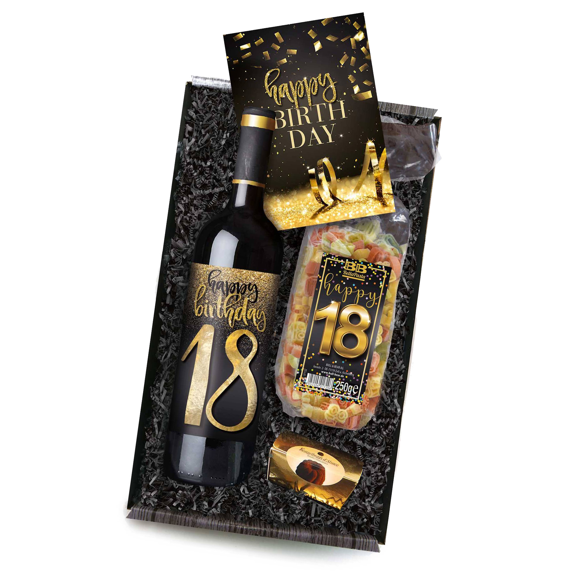 Wenn das Geburtstagskind eher Rotwein bevorzugt, dann hast Du hiermit einen Volltreffer gelandet, denn das 4-teilige Happy Birthday Geschenkset zur Volljährigkeit beinhaltet unter anderem einen leckeren Geburtstagswein, der mit einem feierlichen Etikett versehen ist. Dazu kommen die köstlichen Geburtstagsnudeln in Form einer 18, deren Verpackung ebenfalls ein buntes Happy-Birthday-Etikett ziert. Die passende Geburtstagskarte hat noch ein kleines Geschenk im Inneren: das Saatgut für die ultimativen Gute-Laune-Blumen - die Sonnenblumen im Mini-Format. Ein sonniges Geburtstagspräsent für den Jubilar, das aus der Menge lieblos zusammengestellter Präsentkorbe auf jeden Fall heraustechen wird!
