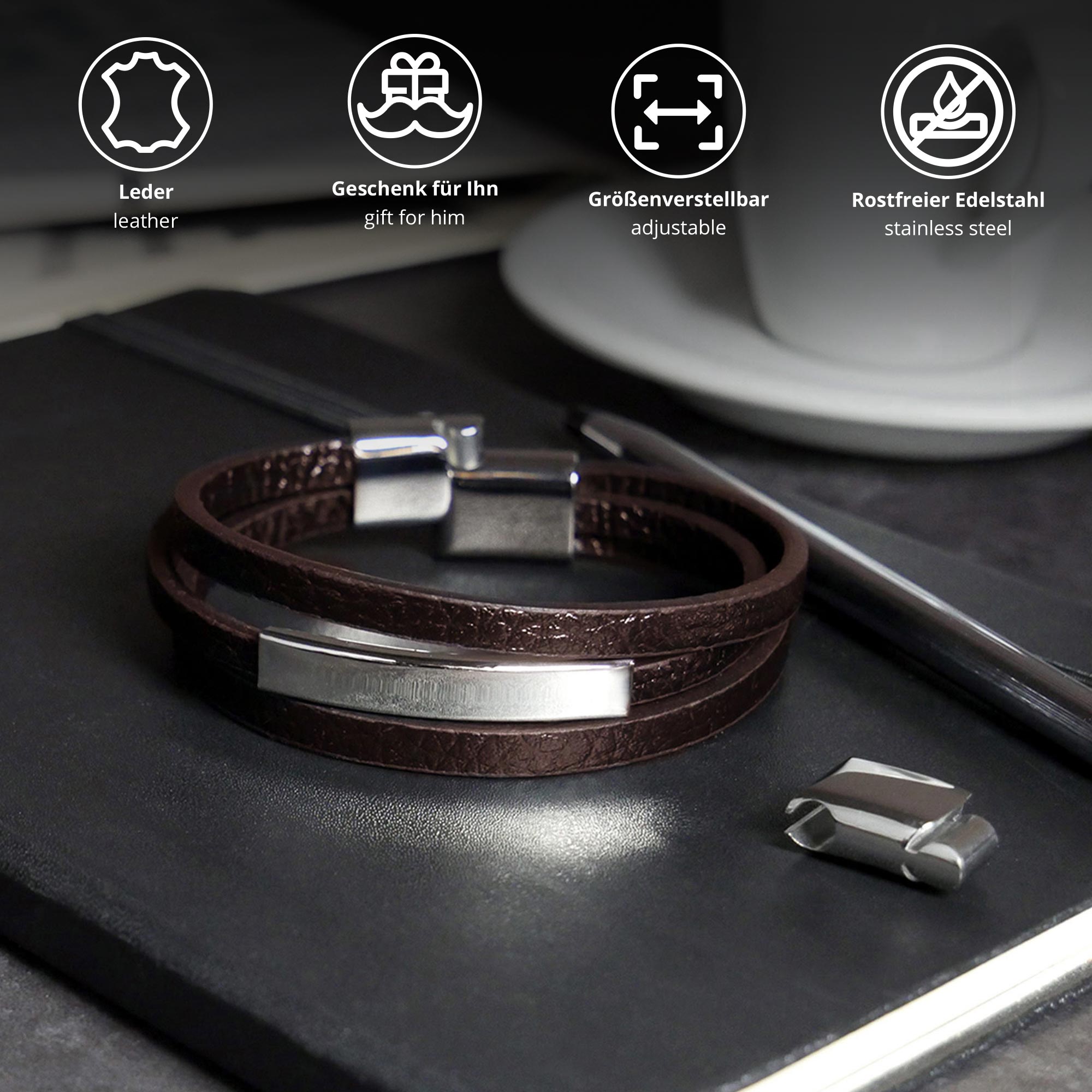 Das Herren-Armband auch Echtleder ist eine hervorragende Geschenkidee für Deinen Partner oder platonische Freunde. Überreiche Deinem Freund oder Ehemann ein außergewöhnliches Schmuckstück mit einer geschickten Kombination aus braunem Leder und silbernem Edelstahl. Die Beschenkten werden sich vor Begeisterung kaum noch zügeln können und mit großer Wahrscheinlichkeit das Lederband direkt in ihren Feiertagslook integrieren!