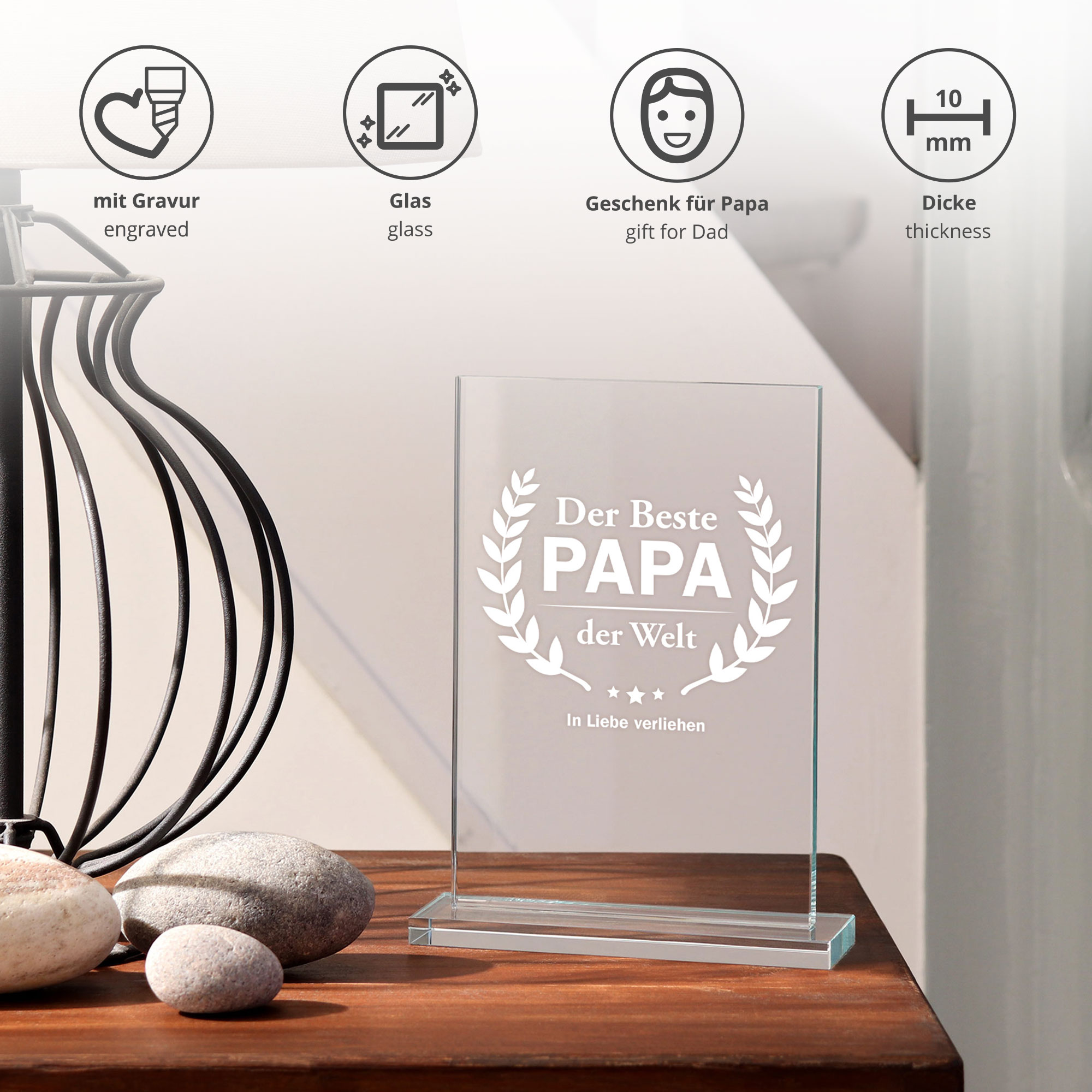 Mehr geht nun wirklich nicht: Mit dem Glaspokal adelst Du Deinen Papa zum weltbesten Vater überhaupt und zeigst Deine volle Anerkennung. Der Glas-Pokal würdigt Deinen Vater mit der sorgfältigen Gravur "Der beste Papa der Welt", die von Zweigen und Sternchen umgeben ist. Der Hinweis "In Liebe verliehen" unter dem Gravurmotiv vollendet Deine besondere Trophäen-Botschaft. Die schlichte Glasdeko präsentiert sich in einer edlen Geschenkbox mit roter Satineinlage und überzeugt daher auch optisch auf voller Länge. Eine edle Dekoration aus Glas mit stabilem Sockel, die am richtigen Plätzchen garantiert zum Blickfang wird.