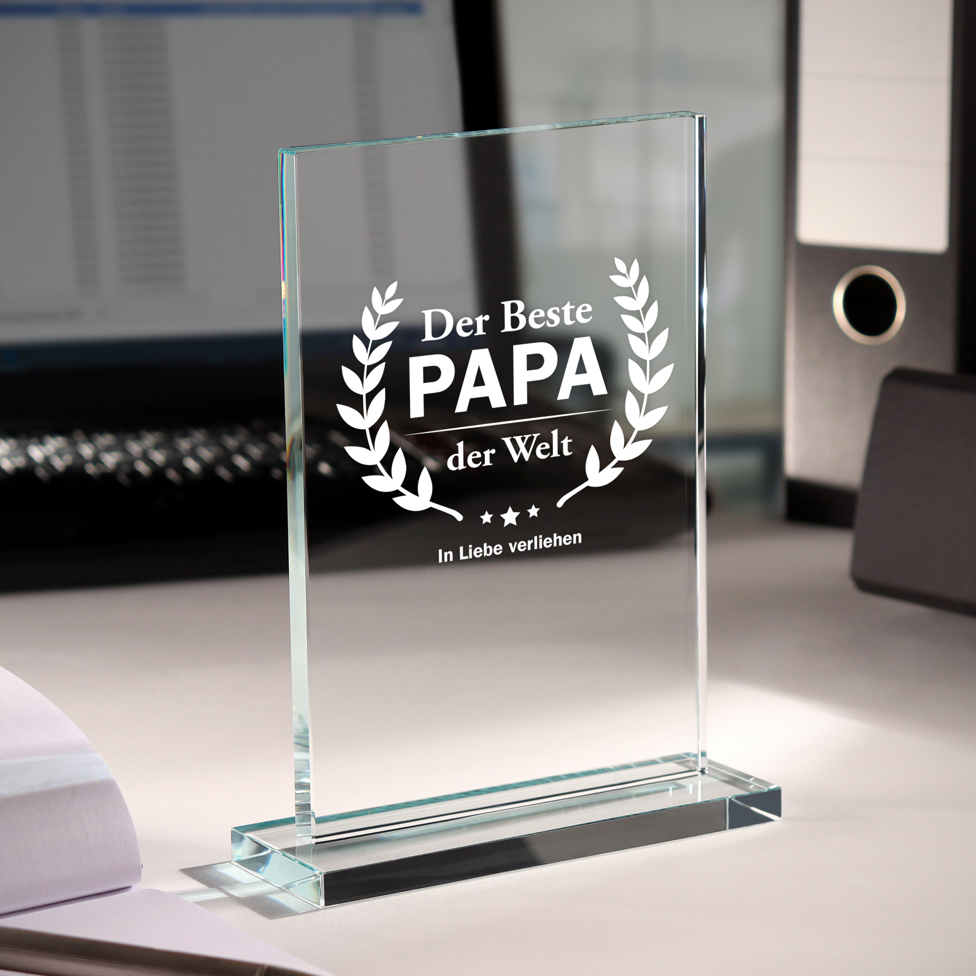 Der Pokal aus Glas ist ein wahrer Alleskönner unter den Geschenken für Papa. Ob zum Vatertag, Geburtstag oder zu Weihnachten: Der Glasständer mit Gravur wird zu jedem Anlass für Erstaunen sorgen. Überreiche ein außergewöhnliches Vatertagsgeschenk an Deinen Papa und ehre ihn mit der gravierten Trophäe auf eine ganz spezielle Art und Weise. Überrasche mit einem Symbol der Dankbarkeit, Zuneigung, Verbundenheit, Liebe und Wertschätzung in nur einem gläsernen Präsent!