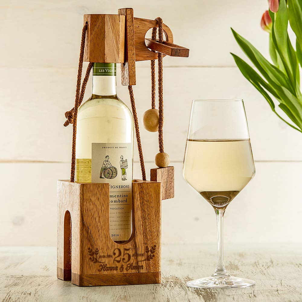 Verpacke eine Weinflasche oder einen anderen edlen Tropfen in dem dunklen Edelholz Flaschenpuzzle und folge der Anleitung, um den Verschluss durch Knoten, Drehen und Ziehen herzurichten. Das von Dir geschaffene Geduldspiel bedarf voller Konzentration und ein wenig Kreativität, um es zu lösen. Amüsiere Dich über die Öffnungsversuche des beschenkten Paares mit dem Gedanken, dass Du jederzeit helfen könntest. Eine geniale Geschenkidee für Freunde oder Familie zum 25. Hochzeitstag!