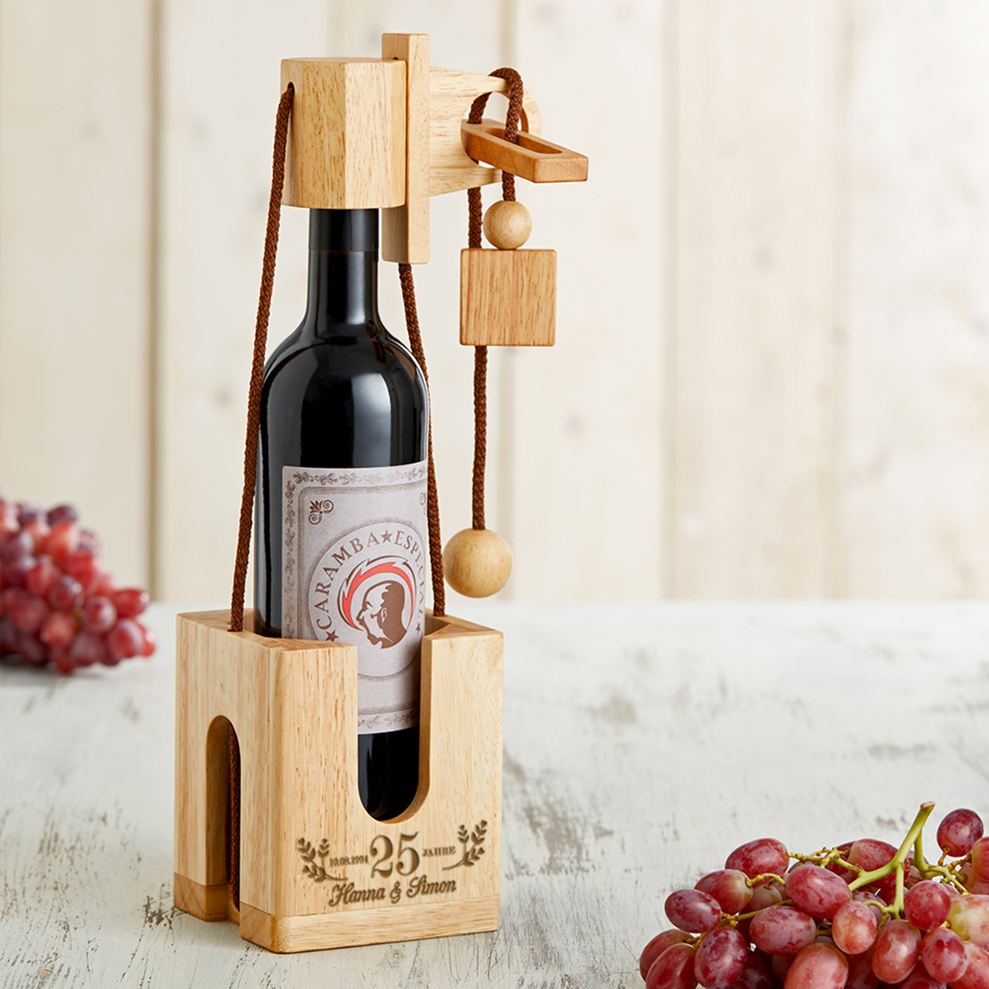 Liebe geht durch den Magen. Bei einem angenehmen Kochabend in der heimischen Küche darf der passende Wein selbstverständlich nicht fehlen. Ein köstliches Glas Wein rundet die Gaumenfreude erwiesenermaßen ab. Um anzustoßen und auf die gemeinsame Zeit der Ehe zurückzublicken, muss das Geschenk zur Silberhochzeit erst einmal geöffnet werden. Hier sind Kreativität und Geduld gefragt. Das beschenkte Paar muss das hölzerne Rätsel mit Geschick lösen. Die magische Geschenkbox eignet sich für jede konventionelle Weinflasche. Auf diese Weise wählst Du problemlos den richtigen Weiß- oder Rotwein aus, der von den Feiernden am liebsten getrunken wird. Die massive Verarbeitung des Holzes gewährleistet eine hohe Langlebigkeit des Produktes. Das Puzzle ist dadurch stets wiederverwendbar. Für den besonderen Tag der Silberhochzeit besitzt das Präsent die nötige Originalität und Besonderheit, um der Wichtigkeit des Tages gerecht zu werden.
