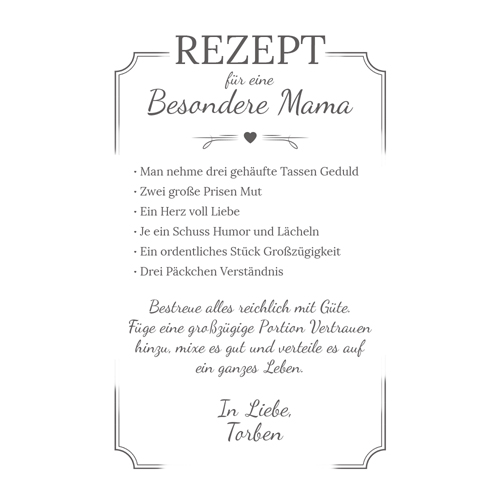 Auf das stilvolle Buchenholzbrett mit abgerundeten Ecken gravieren wir professionell und liebevoll formuliert die wichtigsten Eigenschaften ganz besonderer Mütter. Aber natürlich listen wir diese Kriterien nicht einfach bloß auf. Passend zu den gefühlvollen Emotionen, die Dich dazu bewegen, Deiner Mama ein ganz persönliches Geschenk zu machen, nehmen wir die Beschriftung des Brettchens in besonderer Form vor. Wir gravieren sie für Dich in der typischen Rezeptform - dazu kommt auf wertige weise Dein Name darunter. So wird das stilvolle Brettchen nicht nur zu einem hübschen und zugleich nützlichen Haushaltsgegenstand, sondern sogar zu einem kleinen personalisierten Kunstwerk, über das sich ganz bestimmt jede Mama freuen wird.