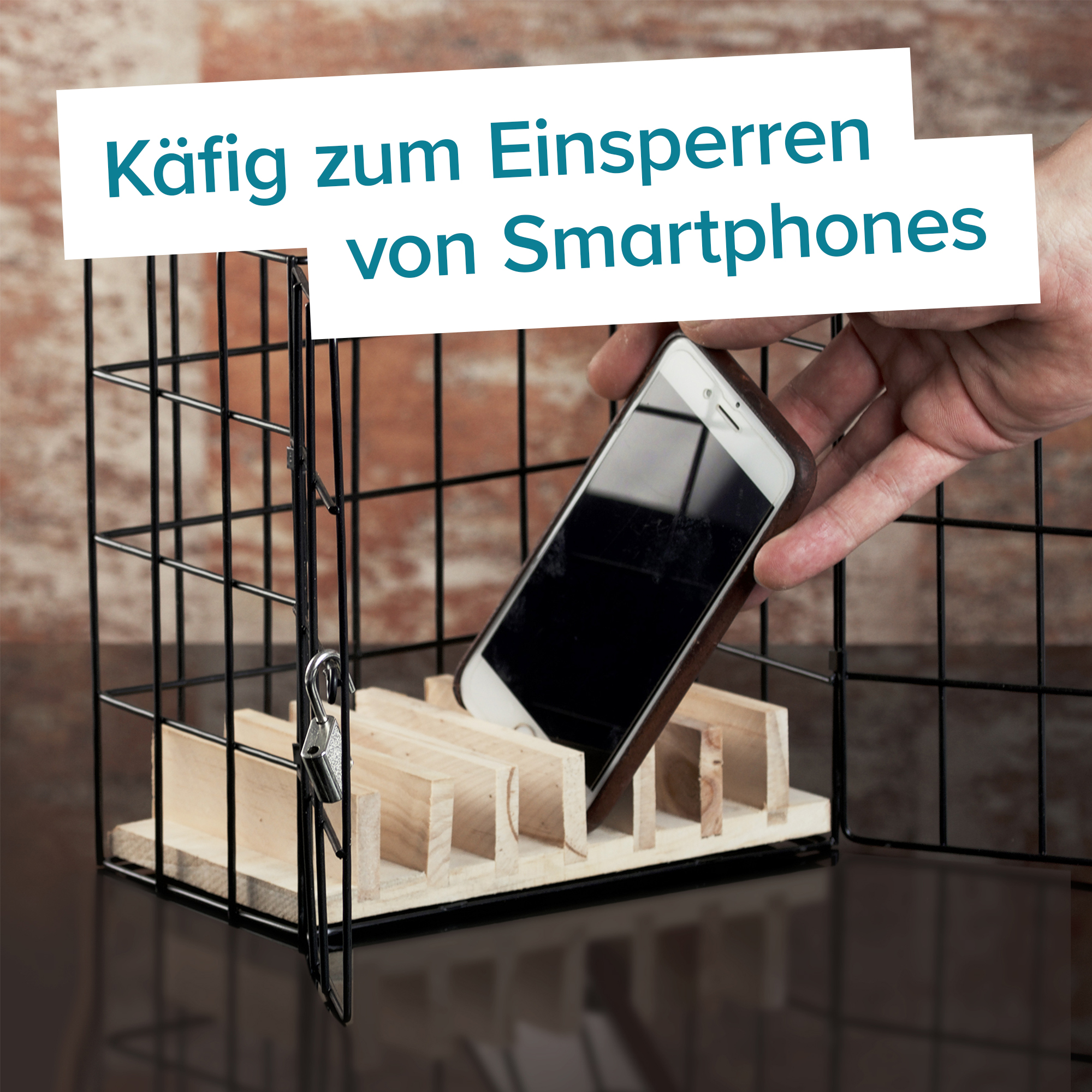 - Kleiner, abschließbarer Käfig mit einer Halterung für bis zu 6 Smartphones