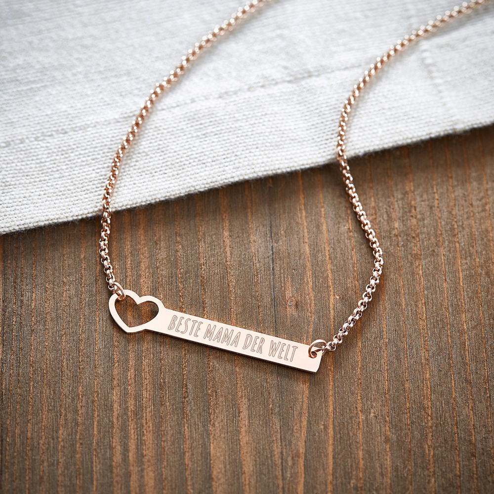 Die gute Nachricht: Diese Kette wird all Deinen hohen Ansprüchen gerecht! Ein wundervolles Schmuckstück, das sich in seiner zurückhaltenden Schlichtheit in jeden Stil einfügen wird. Die feingliedrige Kette ist vorne durch ein schmales Plättchen verbunden, das fortan den Hals Deiner Mutter zieren wird. Die Metallfläche ist das Highlight des Schmuckkettchens, denn darin sind ganz besondere Wörter eingelassen: Für die beste Mama der Welt. Damit ist völlig klar, womit sie sich dieses ganz besondere Geschenk verdient hat. Links neben der Gravurschrift ist eine kleine Herzstanze eingelassen, die die Botschaft Deines Geschenkes unterstreicht.