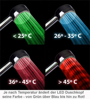 Möchtest Du Dein Badezimmer mit wenig Aufwand in einen richtigen Wellness-Tempel verwandeln? Dann ist der LED Duschkopf mit Farbwechsel genau das Richtige für Dich. Er setzt ganz besondere farbliche Highlights unter Deiner Dusche. Denn dieser originelle Duschkopf ändert, der Wassertemperatur entsprechend, automatisch seine Farbe. Bist Du ein Kaltduscher, darfst Du Dich über ein vitalisierendes Grün freuen. Warmduscher hingegen, genießen ein feuriges Rot. Duscht Du lieber bei mittleren Temperaturen, wird Dich ein erfrischendes Blau umgeben.