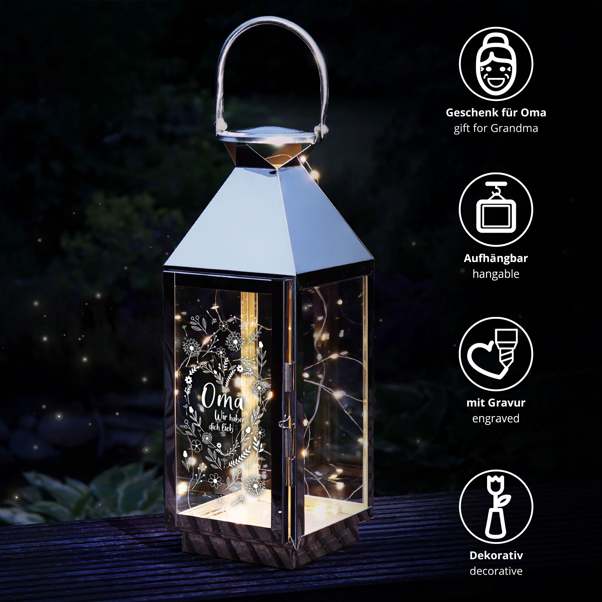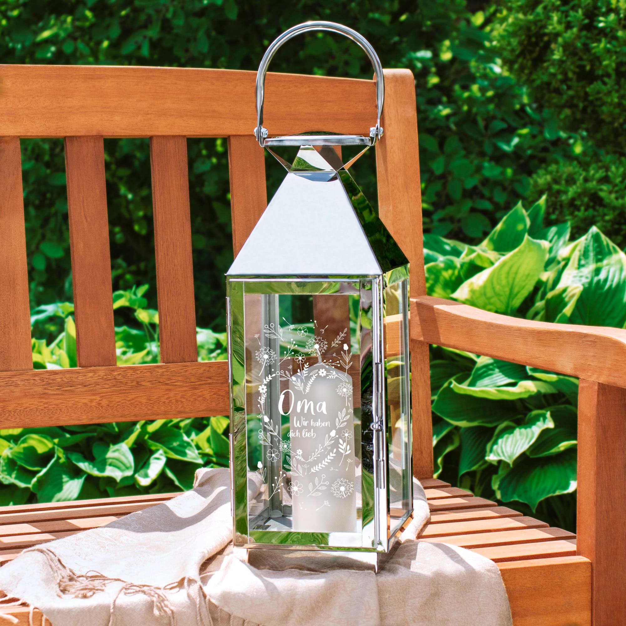 Die wetterfeste Gartenlaterne überzeugt mit Trageseil, Deckelbelüftung sowie klappbarer Seitentür und wird mit einer auffälligen Blumenherz-Gravur versehen. Inmitten eines herzförmigen Blütenmeeres erstrahlt der Schriftzug "Oma, Wir haben Dich lieb", der das silberne Design gefühlvoll abrundet. Zeige Deiner Großmutter Deine ganze Zuneigung und überreiche die stilvolle Kerzenlaterne für Garten, Terrasse, Balkon oder auch das Wohnzimmer.