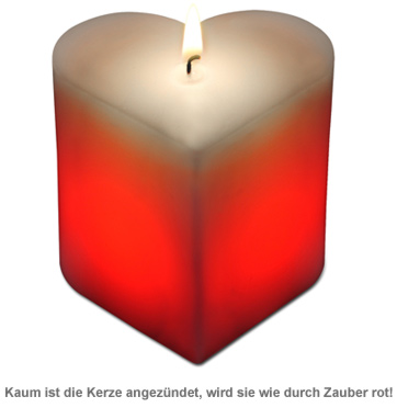 Bei dieser Liebeskerze handelt es sich nämlich um eine ganz besondere Art von Kerze:Die Magische Kerze sieht zunächst wie eine gewöhnliche weiße Kerze in Herzform aus. Doch ihre Magie entfaltet sich erst beim Anzünden des Dochtes, dann fängt nämlich das versteckte LED Licht an zu leuchten und zwar in der Farbe der Liebe - in sattem Rot! Romantischer geht es gar nicht! Entspanne beim gemütlichen Kerzengeflacker oder veranstalte einen romantischen Abend für Dich und Deinen Schatz - mit der LED Liebeskerze als schöne Geschenkidee für Deine bessere Hälfte!