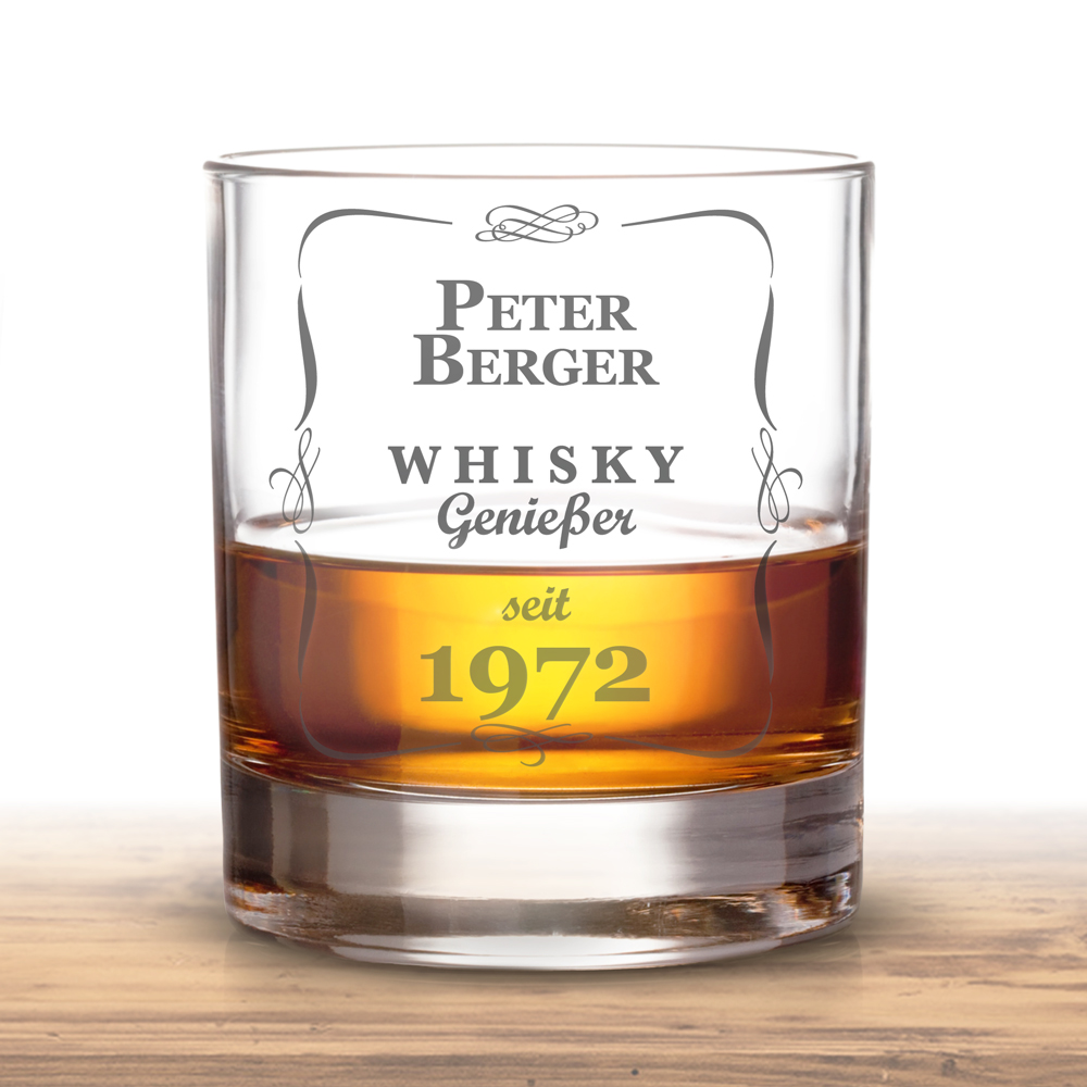 • Mit dem Schriftzug "WHISKY Genießer seit Jahreszahl" und dem Wunschnamen