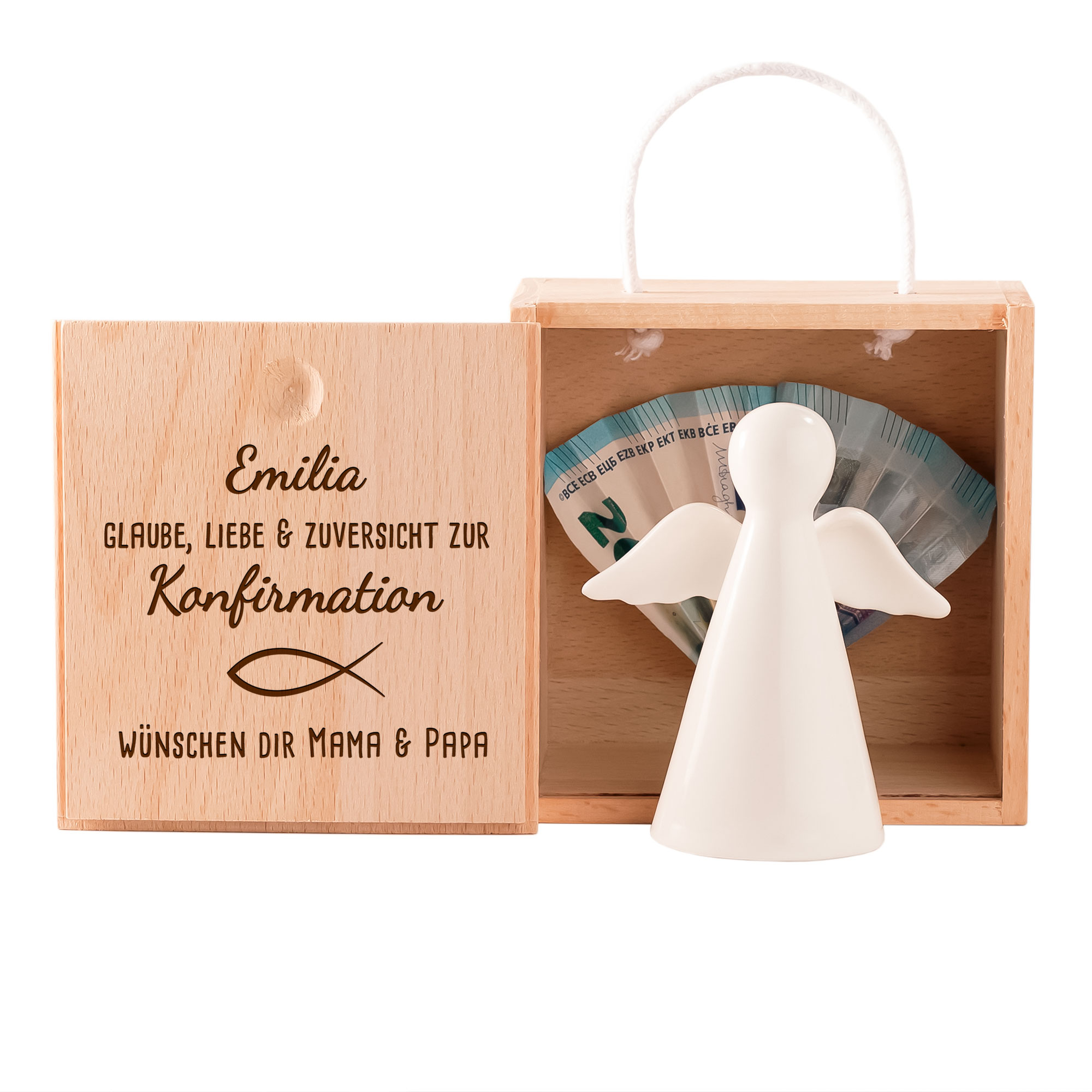 Dieser Engel wird durch den persönlichen Schriftzug "Glaube, Liebe & Zuversicht zur Konfirmation" sowie die Namen der Schenkenden zu einem einzigartigen Erinnerungsstück. Er symbolisiert nicht nur spirituelle Führung, sondern auch die Freude und Hoffnung, die dieser besondere Tag mit sich bringt. Die Holzbox mit der eingravierten Botschaft dient als sicheres Versteck für Geldgeschenke, die oft von Teenagern zur Unterstützung ihrer zukünftigen Träume geschätzt werden.
