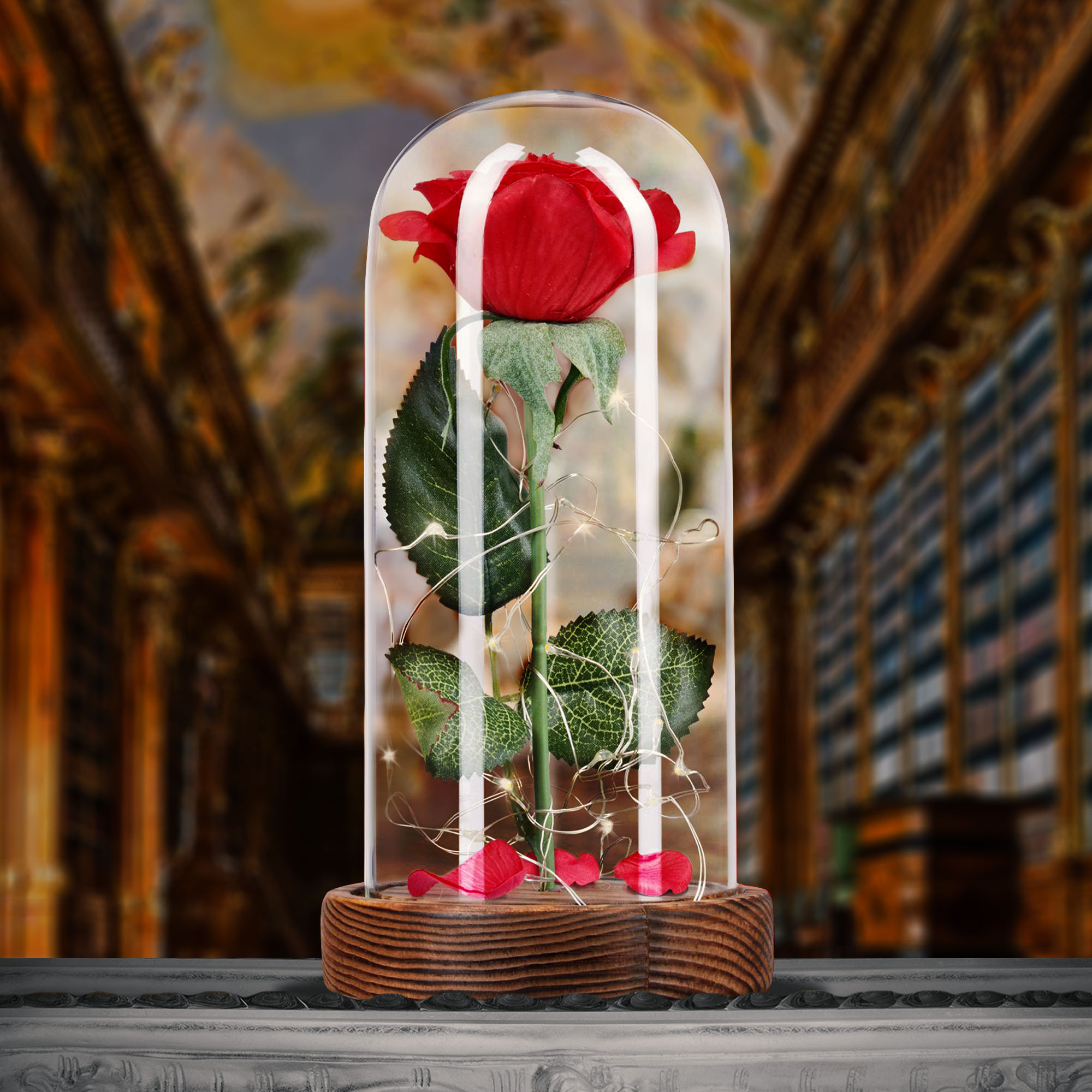 - Künstliche rote Rose auf einem Holzsockel unter einer Glaskuppel