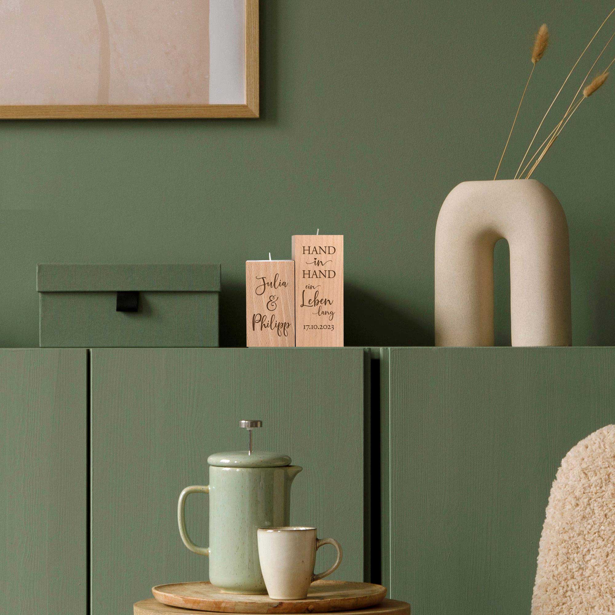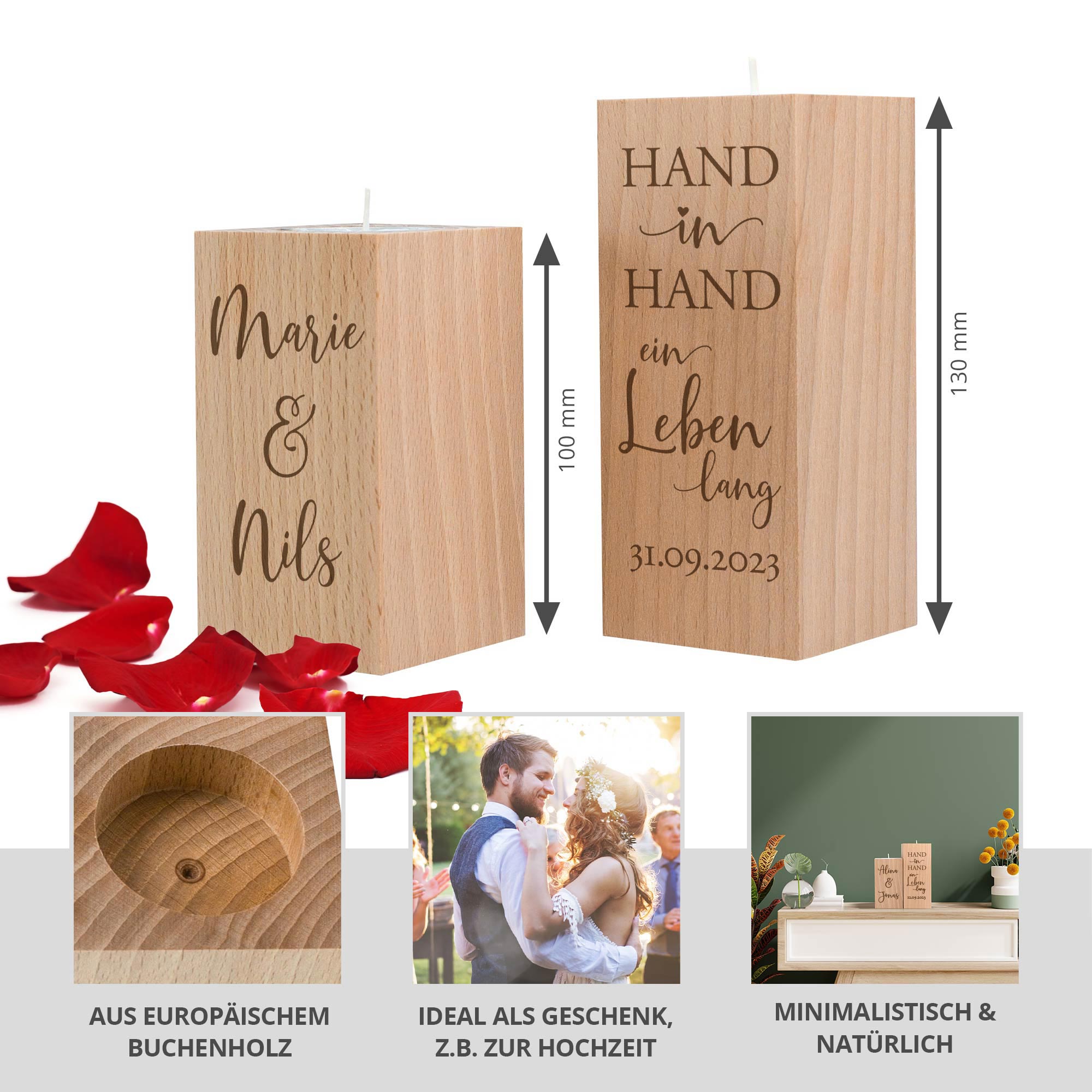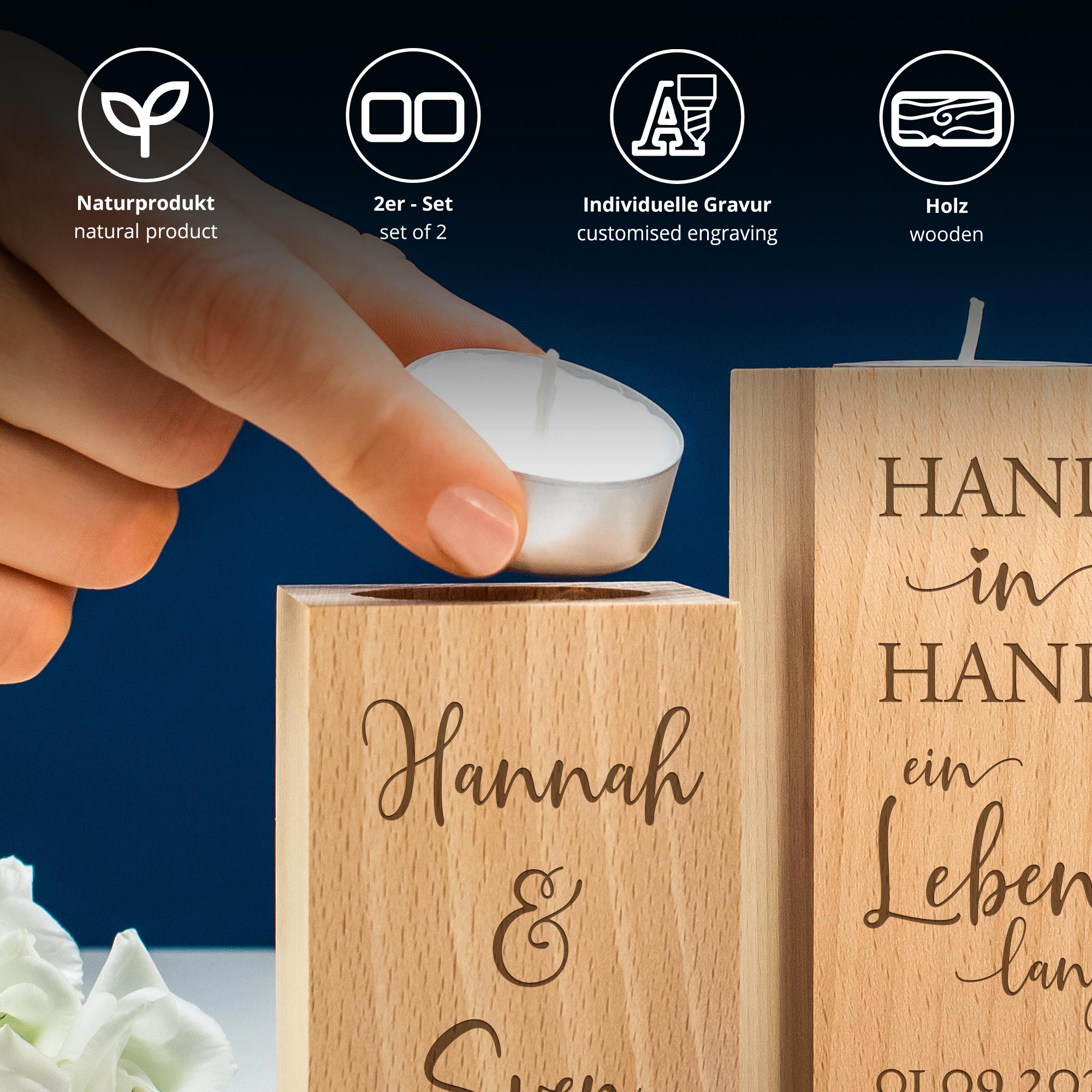 Das Set besteht aus zwei unterschiedlich hohen Kerzenhaltern, die gemeinsam ein harmonisches Gesamtbild ergeben. Passend zum Anlass wird auf dem größeren der beiden Kerzenständer der Hochzeitsspruch "Hand in Hand ein Leben lang" sowie ein individuelles Datum graviert. Auf dem anderen wird sorgfältig die Gravur von zwei Namen verewigt, die dem Teelichthalter Set für das Brautpaar eine persönliche Note verleiht.