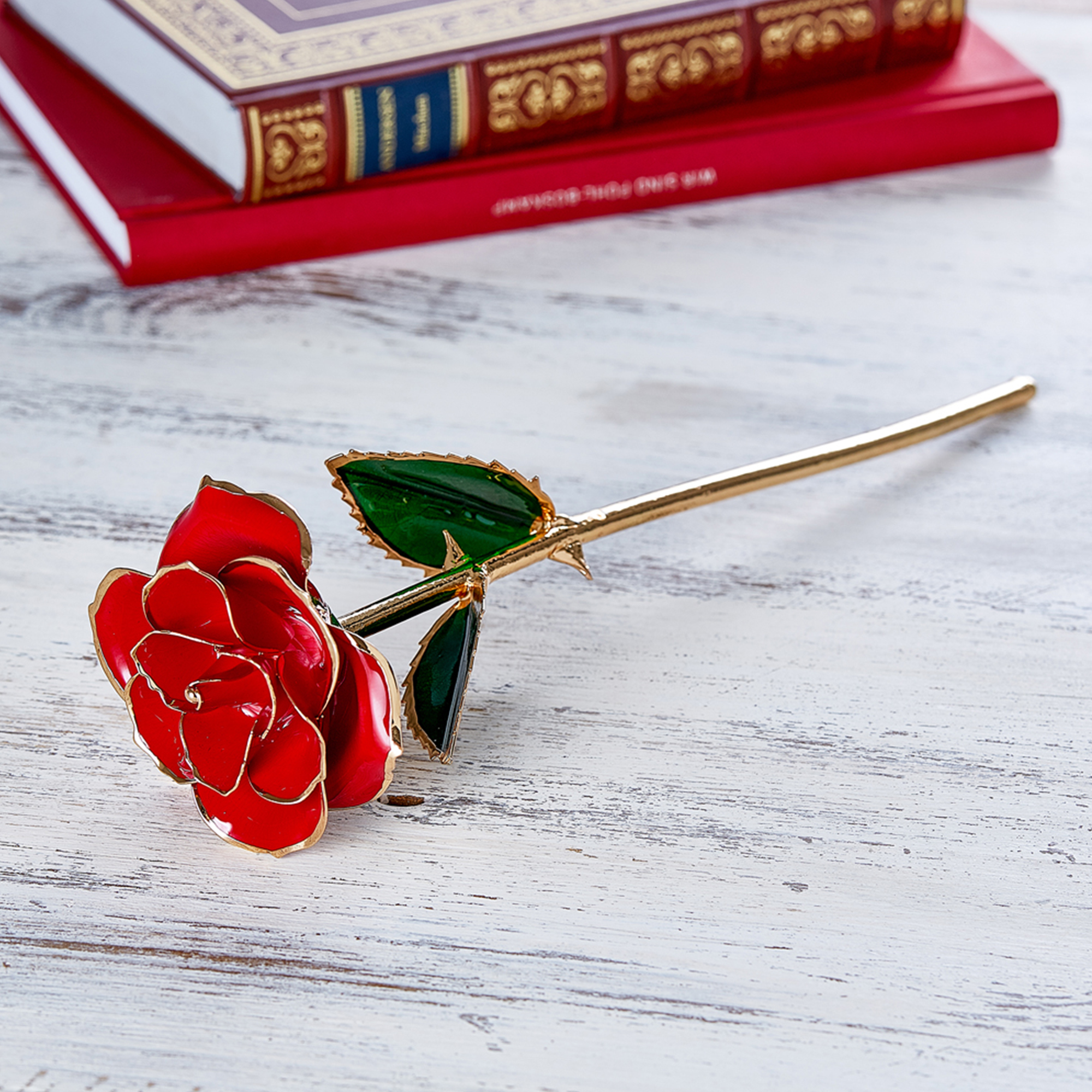 Die Deko Rose, die authentisch einer echten nachgeahmt ist, besticht durch ihr stolzes Erscheinungsbild mit dezentem Glanz auf der Oberfläche. Eine besonders edle Note verleihen ihr die vergoldeten Elemente: Der Rosenstiel ist mit 24 Karat Gold-Überzug versehen, ebenso wie die Umrandung der grünen Blätter sowie der roten Blüte. Was für ein Schmuckstück! Bis zum Ende des Stiels besitzt die Rose eine Länge von 28 cm, die Blüte kommt auf rund 7 cm Durchmesser.