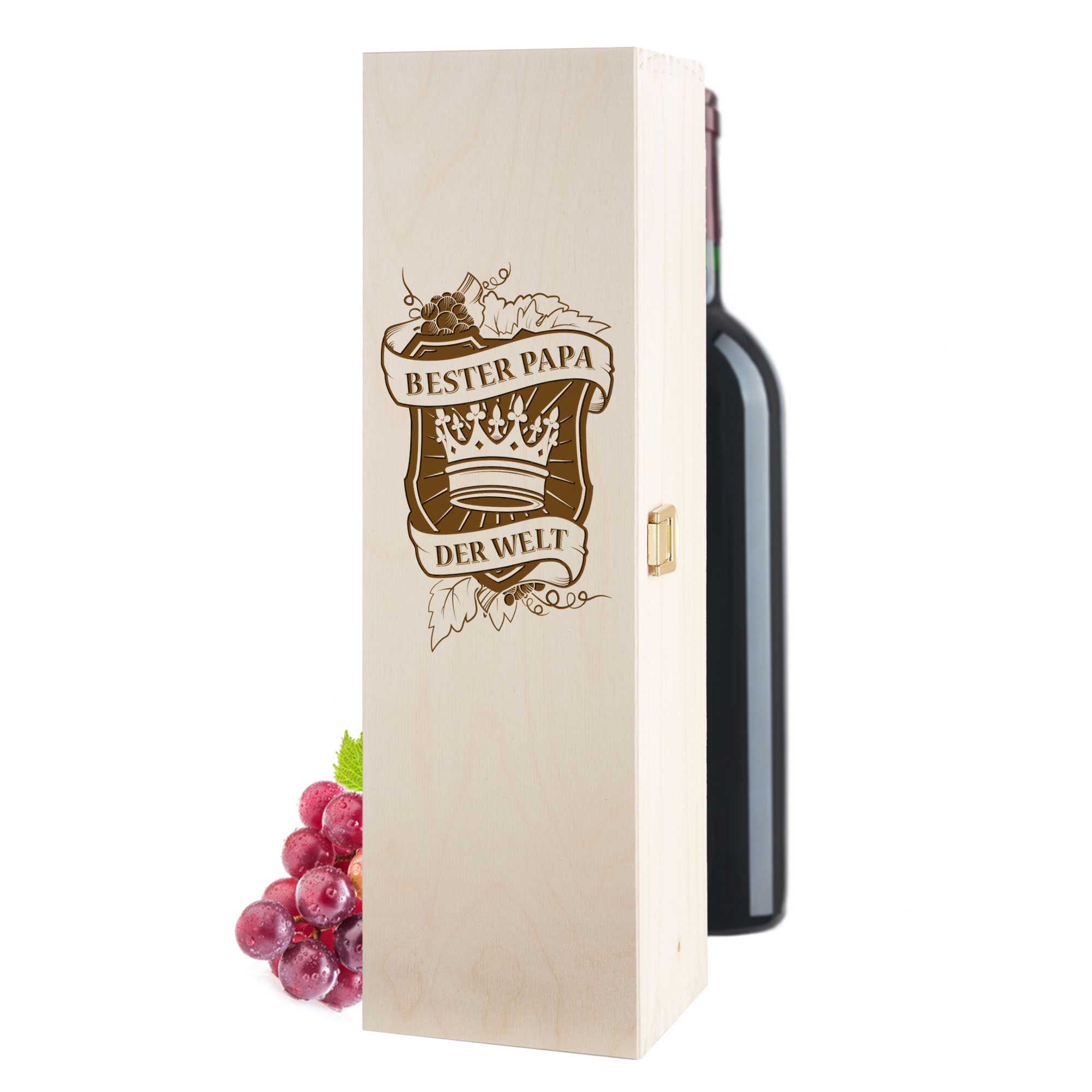 Auf dem Deckel der Geschenkbox ist vor Weintrauben und Weinblättern ein stilvolles Wappen mit Kronen-Motiv graviert, das für einen hochwertigen Gesamteindruck sorgt. Abgerundet wird die Gravur durch ein Banner mit dem Schriftzug "Bester Papa der Welt", womit Du Deinem Vater ein unbeschreibliches Kompliment machst. Besser geht es nicht! Befülle die auffällige Geschenkkiste nach Belieben mit einer Flasche Wein oder anderen Kleinigkeiten wie Süßigkeiten, Gutscheinen oder Erinnerungsstücken. Werde kreativ und kreiere ein einzigartiges Geschenk für den weltbesten Vater!