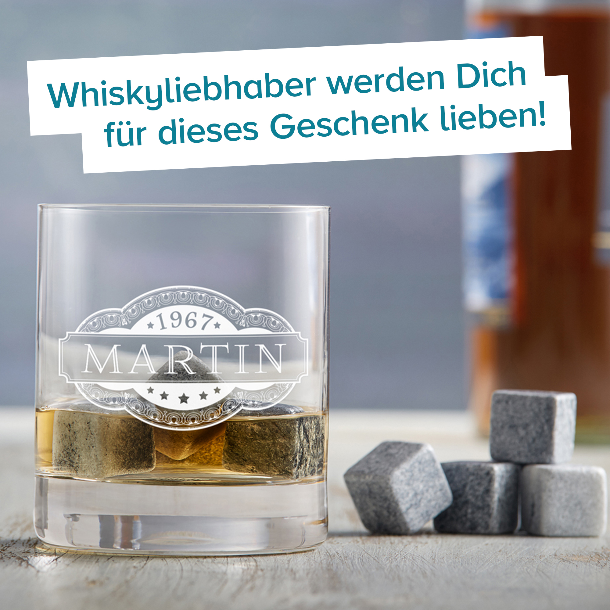 Whisky Set mit Whisky Kühlsteinen und personalisiertem Glas