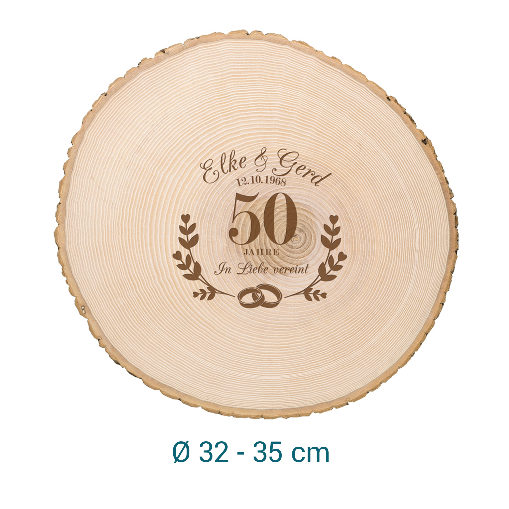 Das naturbelassene runde Holzschild schmückt in der Mitte eine gut sichtbare große 50. Mittig darunter befinden sich die zwei ineinander verschlungene Ringe, die von zwei Myrtenzweigen eingerahmt werden, welche früher als Symbol für die ewige Liebe galten. Oben werden die Namen des Ehepaares sowie das Hochzeitsdatum graviert, so dass genügend Platz für Unterschriften der Gäste bleibt, sollte die Baumscheibe als Hochzeitsgästebuch genutzt werden. Unsere Holzscheibe fungiert dabei nicht nur als Geschenk zur goldenen Hochzeit für das Ehepaar - auch als Tischdeko goldene Hochzeit wird sie zum echten Blickfang.